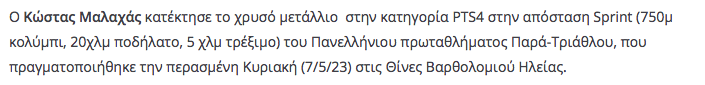 Ο Κ. Μαλαχάς είναι πρωταθλητής Παρατριάθλου (2023) και πέρυσι (2022) ξεκίνησε τη διεθνή του καριέρα. Έχει διπλή, λοιπόν, καριέρα, αυτή του επαγγελματία διαιτολόγου, καθώς και αυτή του αθλητή σε παραολυμπιακό άθλημα, του παρατριάθλου, στην κατηγορία PTS4.